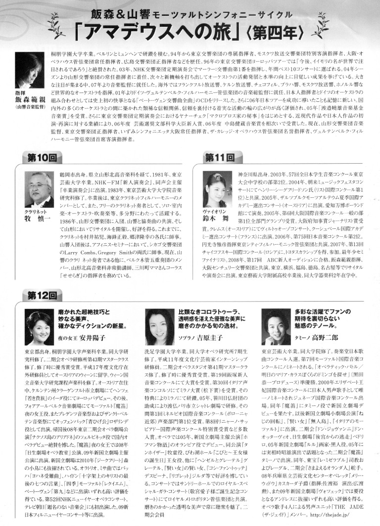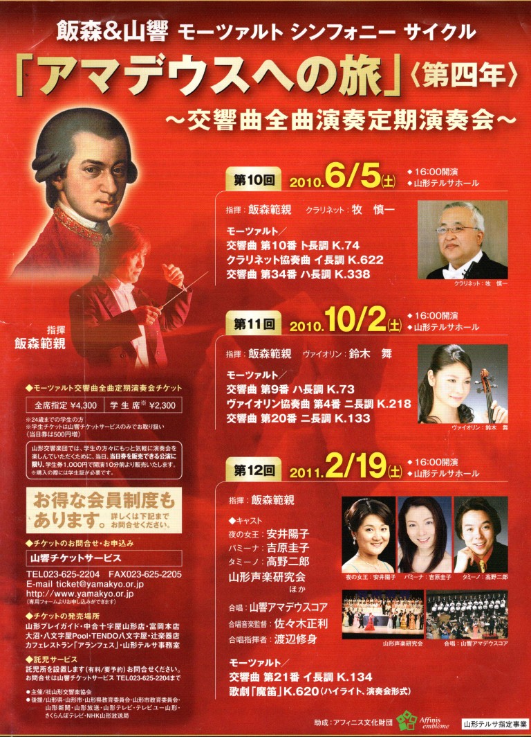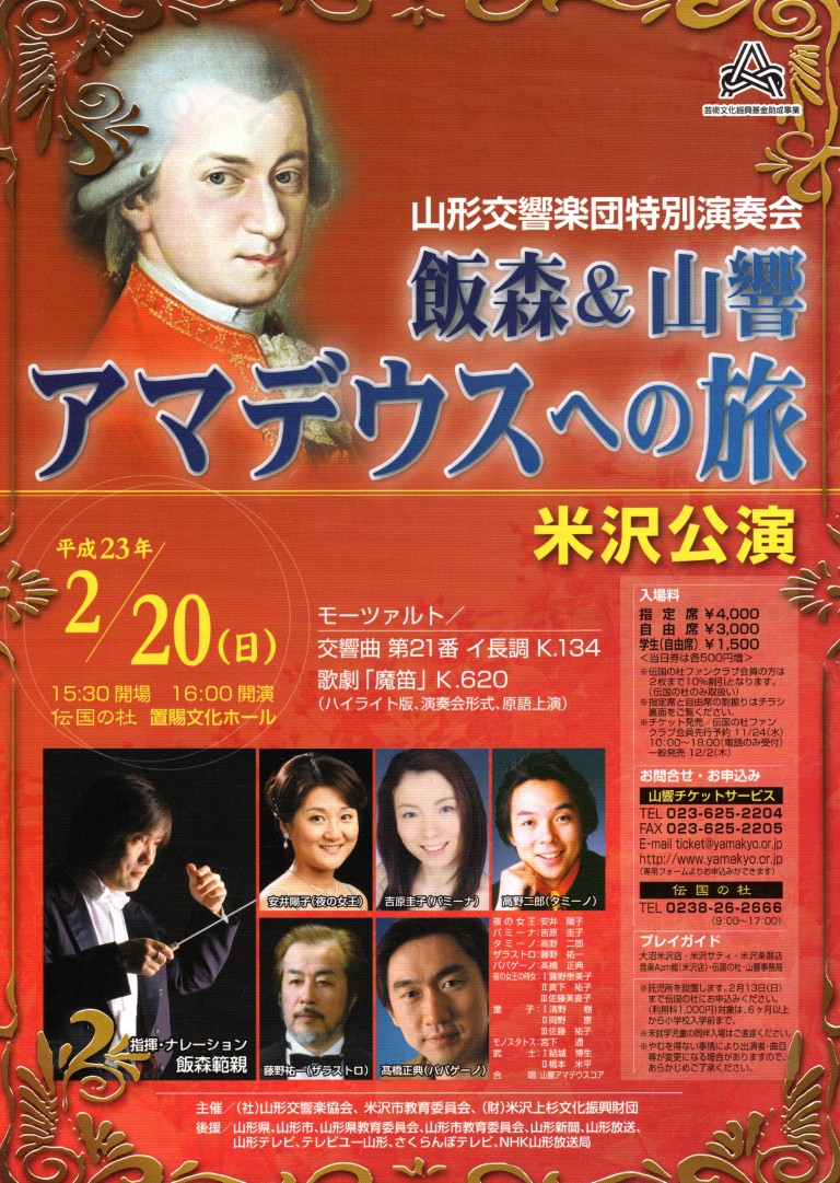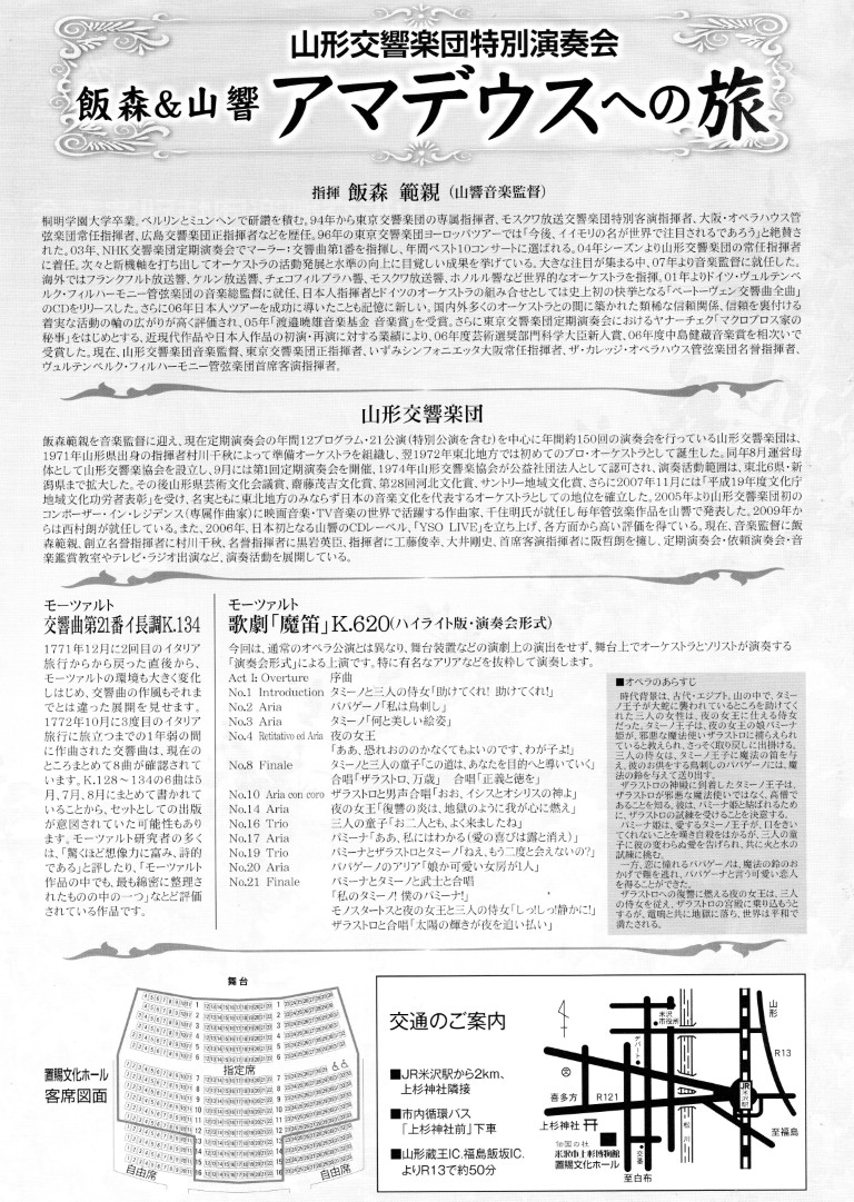 アマデウスへの旅 米沢公演 | モーツァルト/「魔笛」K.620(ハイライト) | 指揮:飯森範親 ソリスト:安井陽子、吉原圭子、高野二郎、藤野祐一ほか 管弦楽:山形交響楽団 合唱:山響アマデウスコア | 伝国の杜置賜文化ホール(米沢) | チラシ表チラシ裏 | |