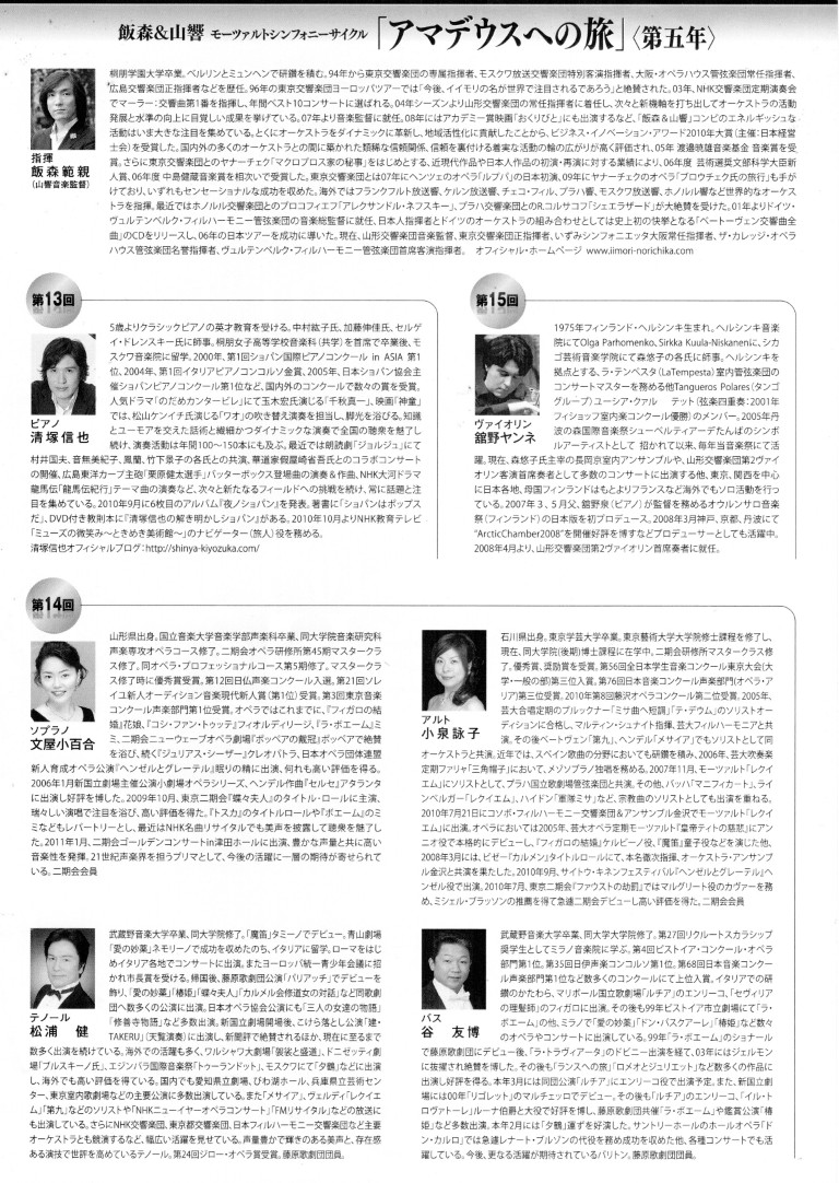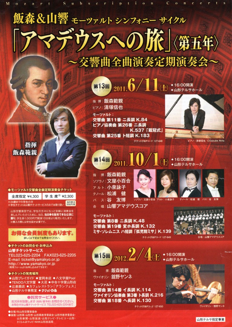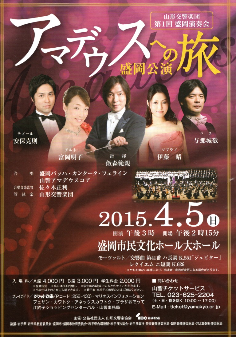 アマデウスへの旅 盛岡公演 | モーツァルト/レクイエム 二短調 K.626 | 指揮:飯森範親 ソプラノ:伊藤 晴 アルト:富岡明子 テノール:安保克則 バス:与那城敬 管弦楽:山形交響楽団 合唱:山響アマデウスコア | 盛岡市民文化ホール | チラシ表チラシ裏 | |