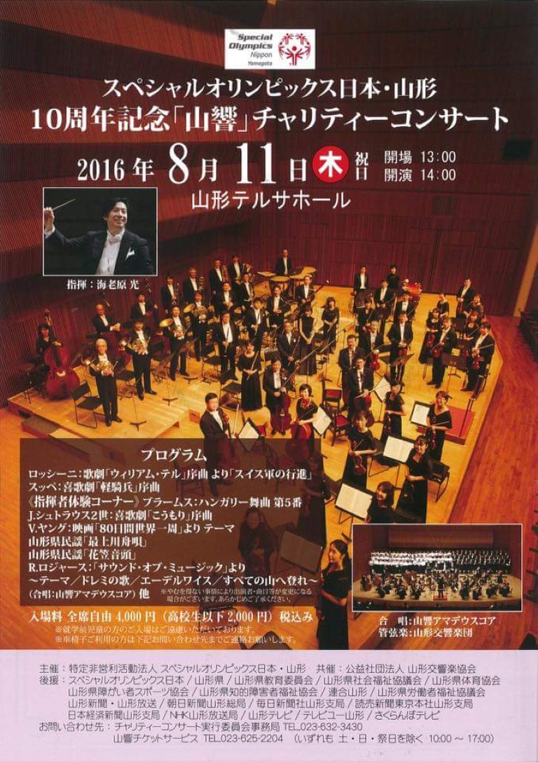 スペシャルオリンピックス日本・山形 設立10周年記念 山形交響楽団チャリティコンサート | R.ロジャース/「サウンド・オブ・ミュージック」より~テーマ/ドレミの歌/エーデルワイス/すべての山へ登れ~ | 指揮:海老原光 管弦楽:山形交響楽団 合唱:山響アマデウスコア | 山形テルサホール | チラシ | |
