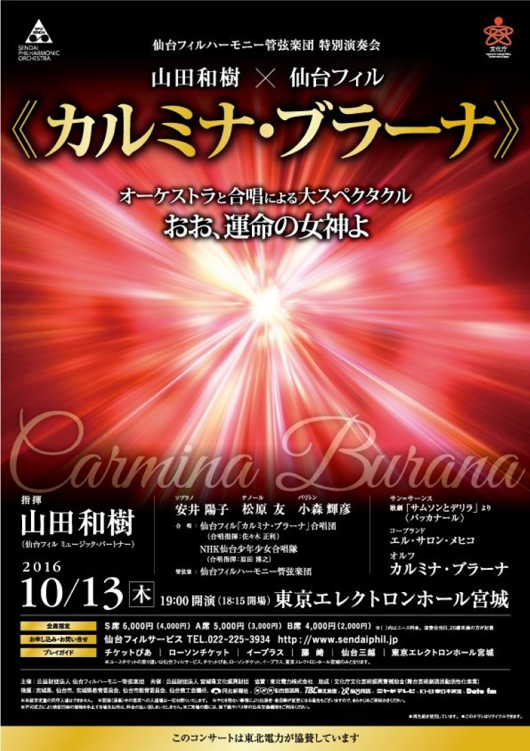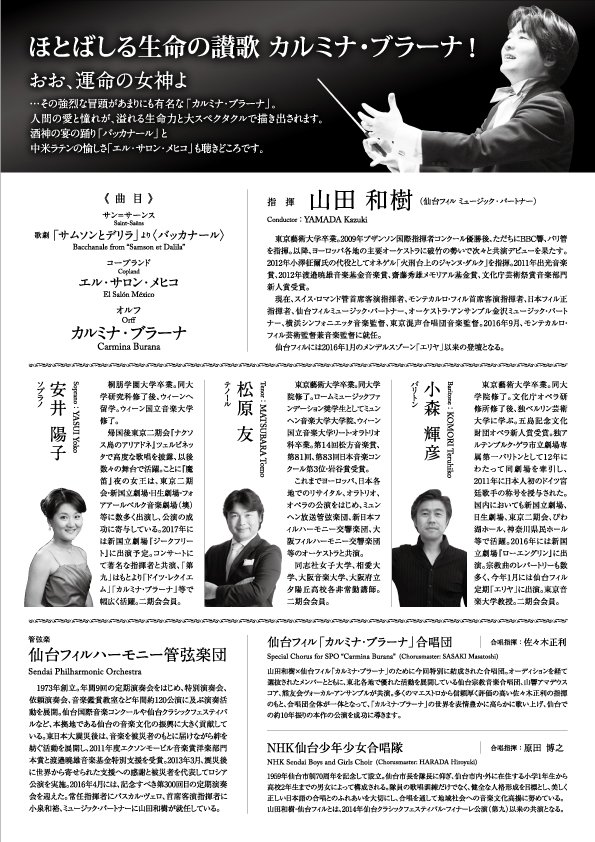 仙台フィルハーモニー管弦楽団特別演奏会 | オルフ/世俗的カンタータ「カルミナ・ブラーナ」 | 指揮:山田和樹 ソプラノ:安井陽子 テノール:松原 友 バリトン:小森輝彦 管弦楽:山形交響楽団 合唱:山響アマデウスコア・他 | 東京エレクトロンホール宮城(仙台) | チラシ表チラシ裏 | |