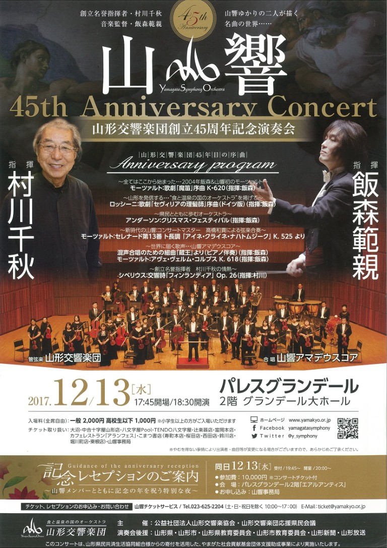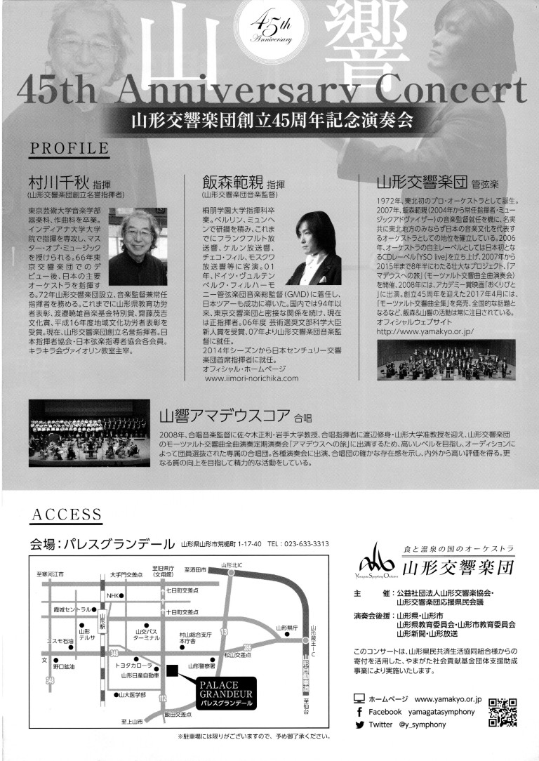 山響創立45周年記念祝賀会 | 佐藤眞/混声合唱組曲「蔵王」より | 指揮:飯森範親 ピアノ:菅原美穂 合唱:山響アマデウスコア | パレスグランデール(山形) | チラシ表チラシ裏 | |
