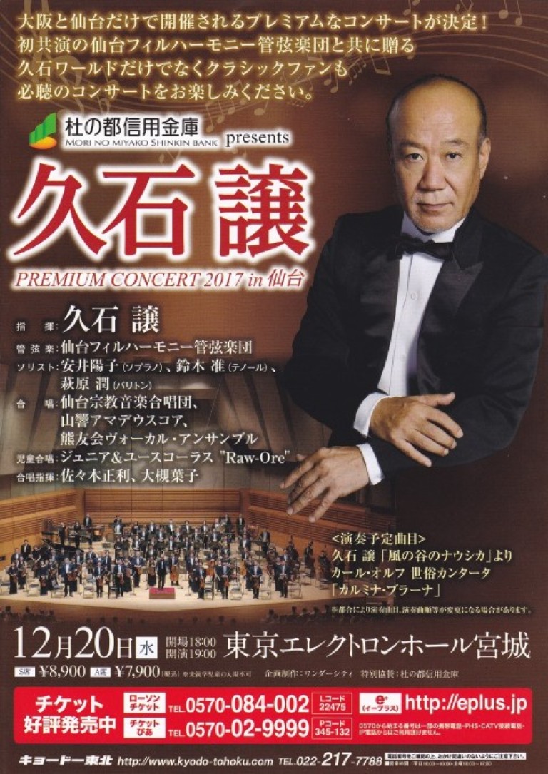 指揮:久石 譲 ソプラノ:安井陽子 テノール:鈴木 准 バリトン:萩原 潤 管弦楽:仙台フィルハーモニー管弦楽団 合唱:山響アマデウスコア・他 | 東京エレクトロンホール宮城(仙台) | チラシ | |