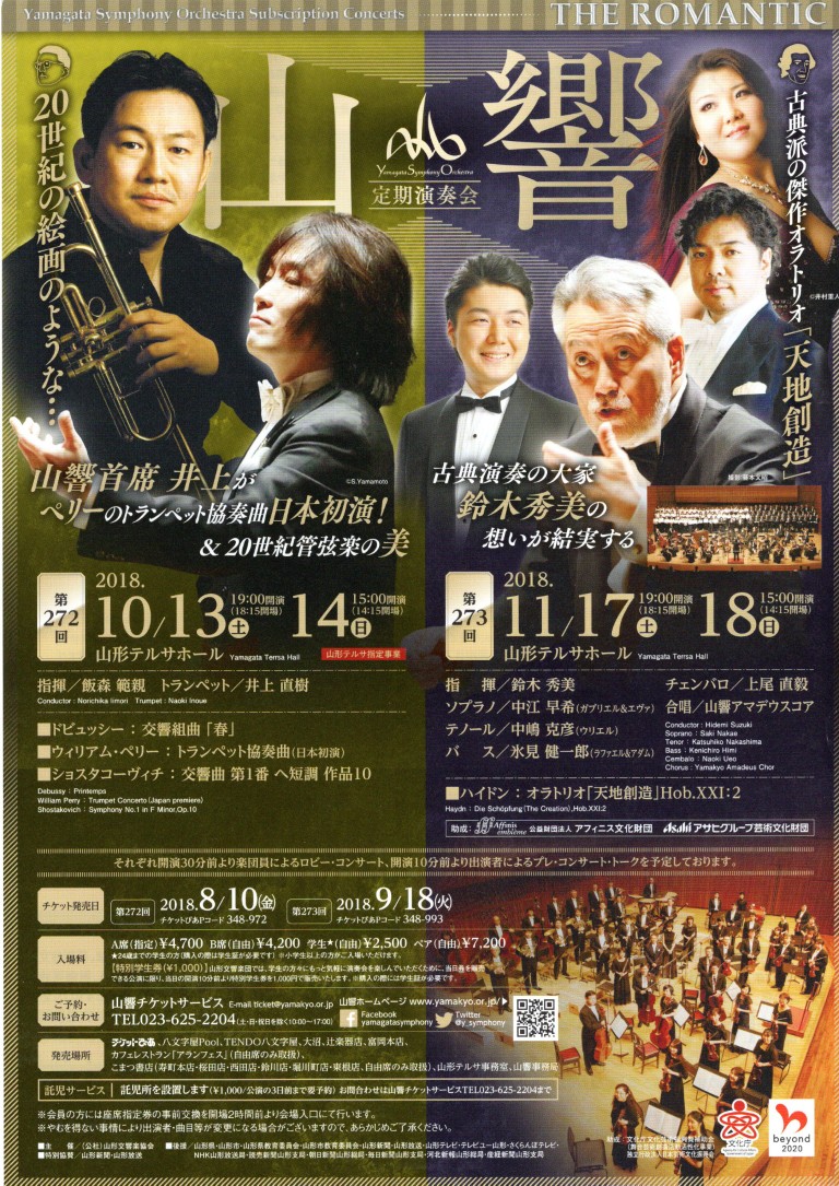 山響第273回定期演奏会 | ハイドン/オラトリオ「天地創造」Hob.XXI-2 | 指揮:鈴木秀美 ソプラノ:中江早希 テノール:中嶋克彦 バス:氷見健一郎 管弦楽:山形交響楽団 合唱:山響アマデウスコア | 山形テルサホール | チラシ表チラシ裏 | |
