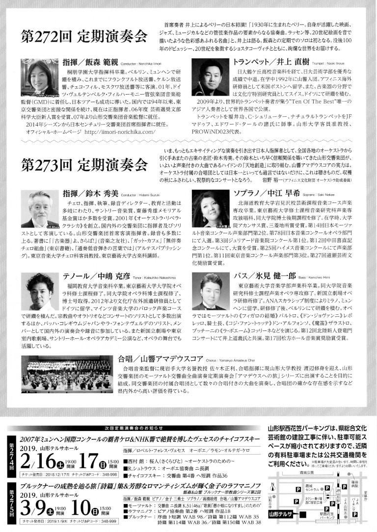 山響第275回定期演奏会 | ブルックナー/詩篇第112篇 WAB35/詩篇第114篇 WAB36/詩篇第150篇 WAB38 | 指揮:飯森範親 ソプラノ:髙橋絵里 管弦楽:山形交響楽団 合唱:山響アマデウスコア | 山形テルサホール | チラシ表チラシ裏 | |