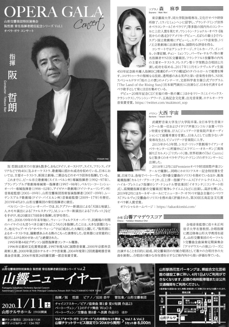 指揮:阪 哲朗 ソプラノ:森 麻季 バリトン:大西宇宙 管弦楽:山形交響楽団 合唱:山響アマデウスコア | 山形テルサホール | チラシ表チラシ裏 | |
