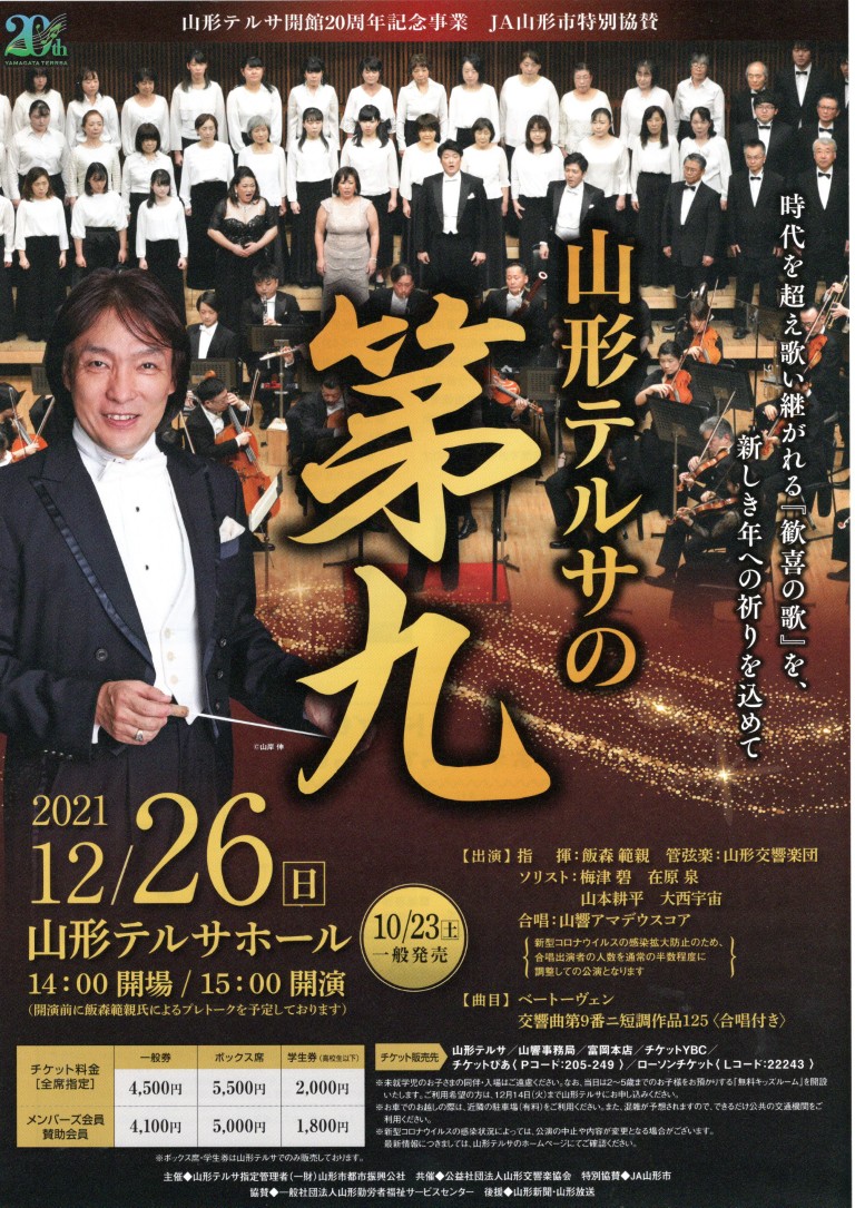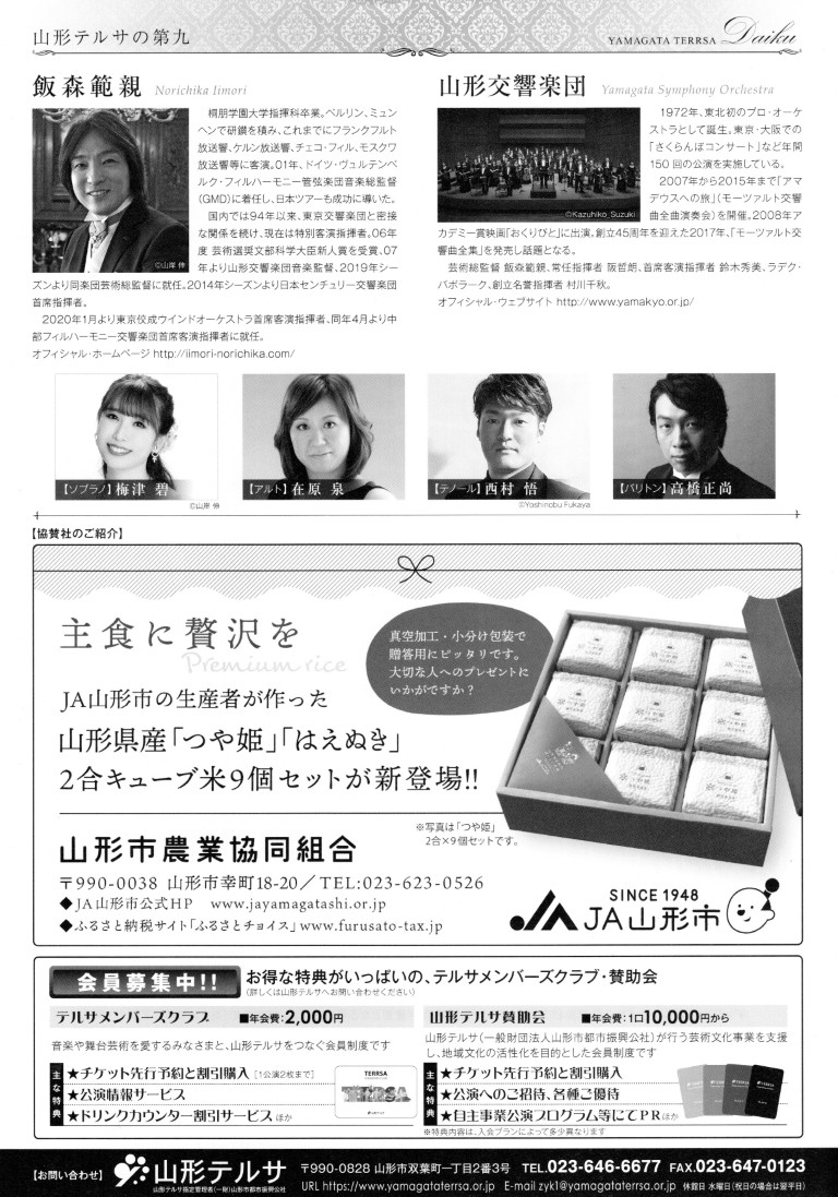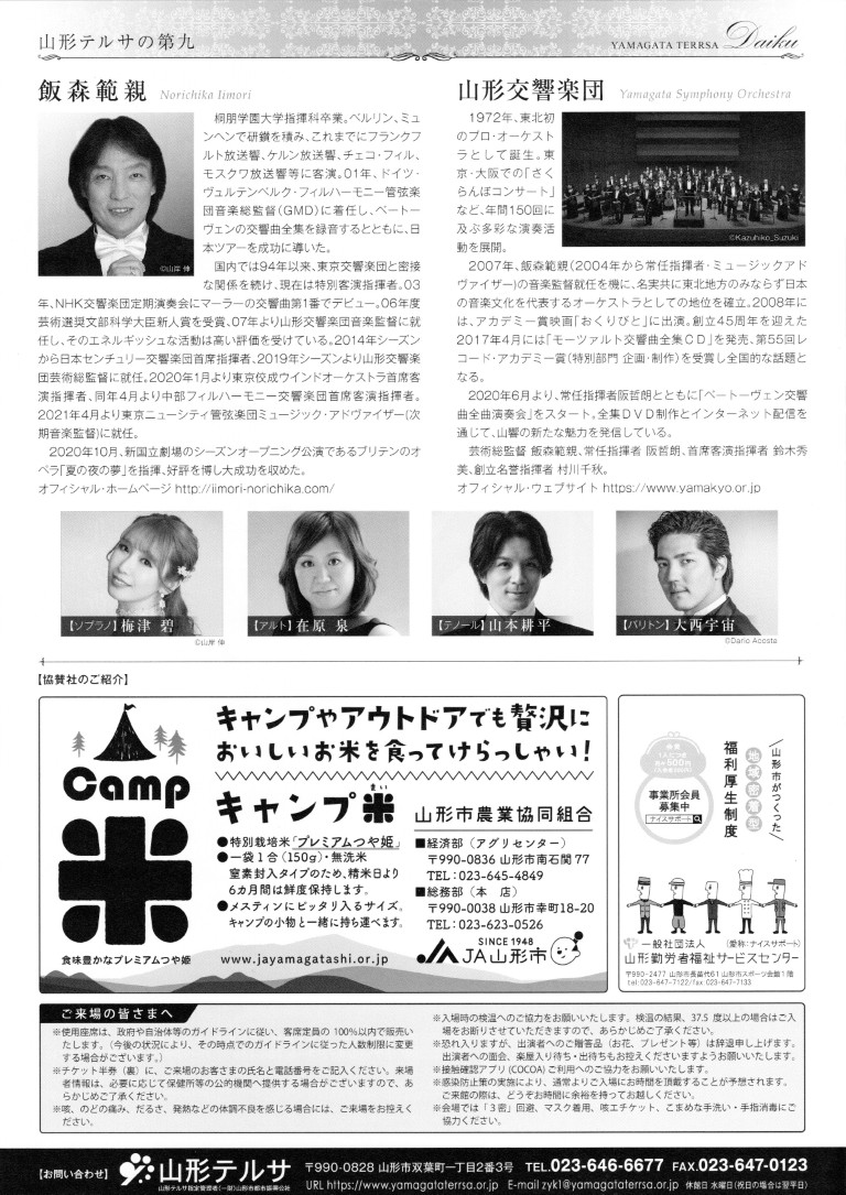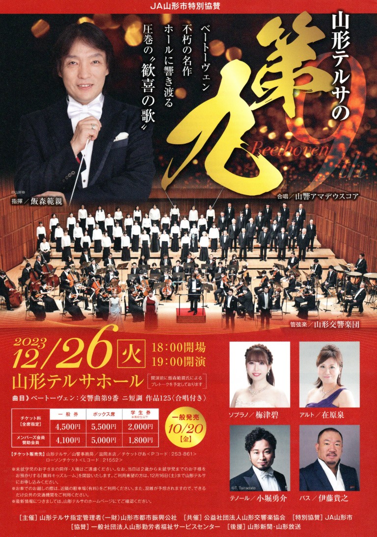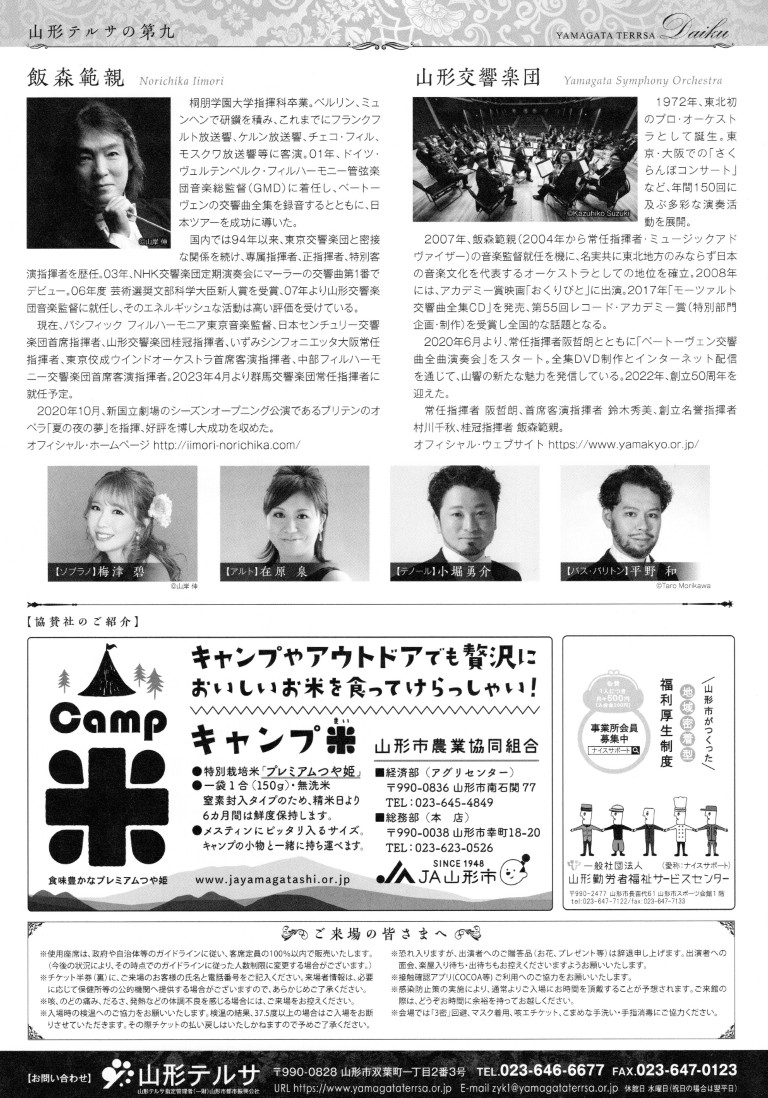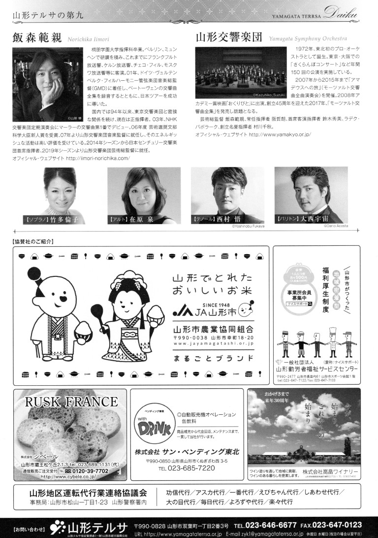 山形テルサの第九⑪ | ベートーヴェン/交響曲第9番 ニ短調 作品125「合唱付き」 | 指揮:飯森範親 ソプラノ:梅津 碧 アルト:在原 泉 テノール:山本耕平 バリトン:大西宇宙 管弦楽:山形交響楽団 合唱:山響アマデウスコア | 山形テルサホール | チラシ表チラシ裏 | |