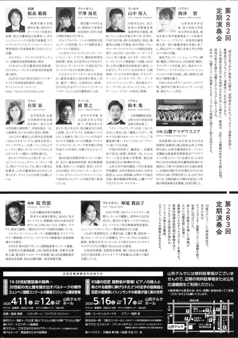 山響第282回定期演奏会 | ブルックナー/ミサ曲第3番 ヘ短調 WAB28 | 指揮:飯森範親 ソプラノ:梅津 碧 アルト:在原 泉 テノール:鏡 貴之 バス:鈴木 集 管弦楽:山形交響楽団 合唱:山響アマデウスコア | 山形テルサホール | チラシ表チラシ裏 | |