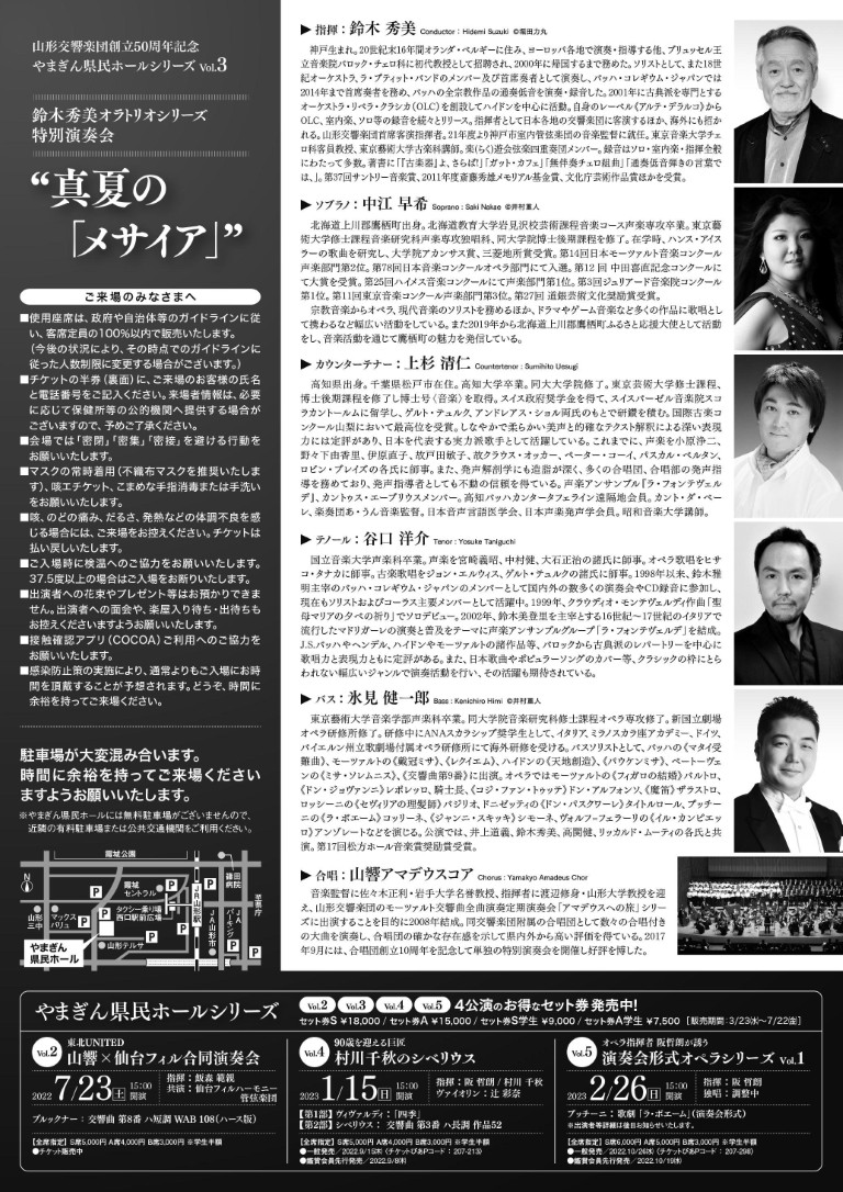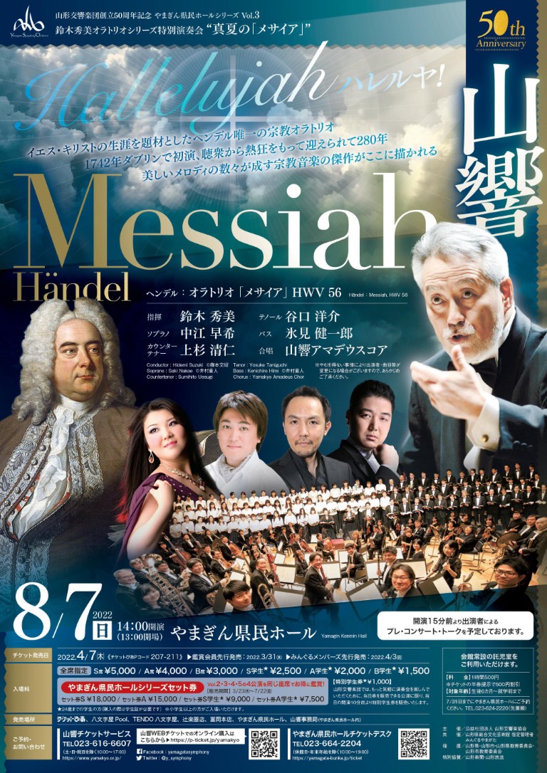 ヘンデル/オラトリオ「メサイア」HWV56 | 指揮:鈴木秀美 ソプラノ:隠岐彩夏 カウンターテナー:上杉清仁 テノール:谷口洋介 バリトン:深瀬 廉 管弦楽:山形交響楽団 合唱:山響アマデウスコア | やまぎん県民ホール | チラシ表チラシ裏 | |