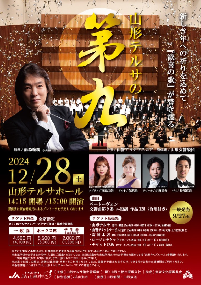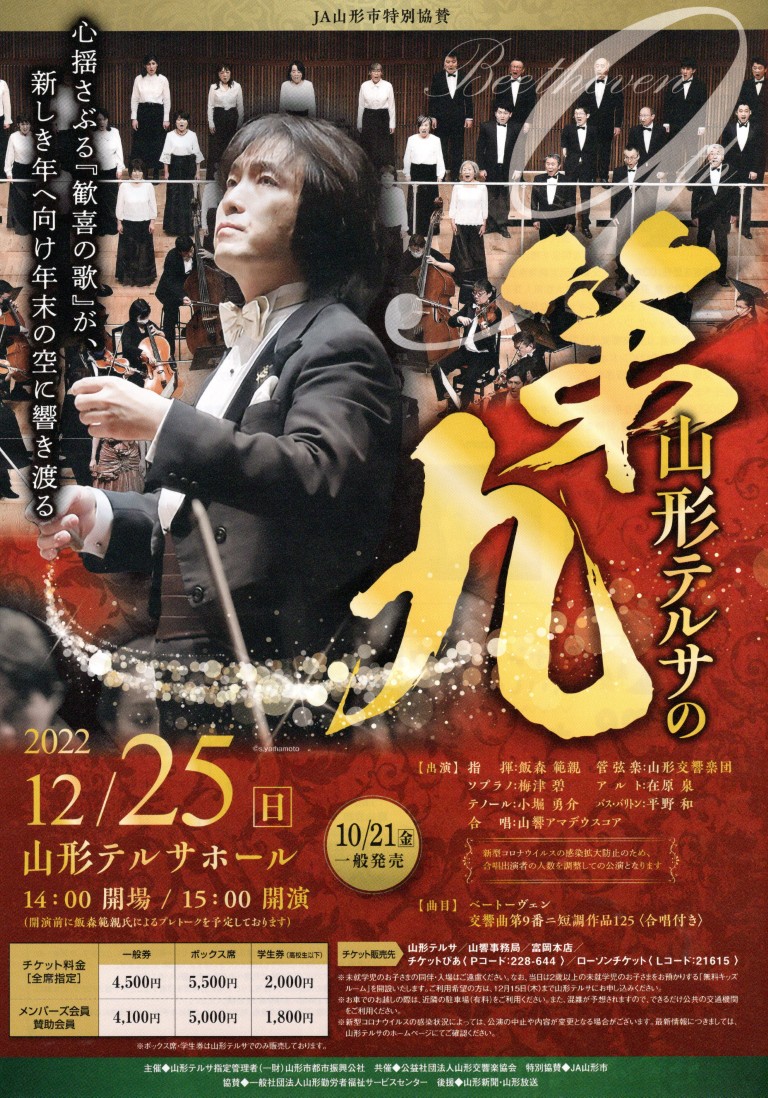 山形テルサの第九⑨ | ベートーヴェン/交響曲第9番 ニ短調 作品125「合唱付き」 | 指揮:飯森範親 ソプラノ:竹多倫子 アルト:在原 泉 テノール:西村 悟 バリトン:大西宇宙 管弦楽:山形交響楽団 合唱:山響アマデウスコア | 山形テルサホール | チラシ表チラシ裏 | |