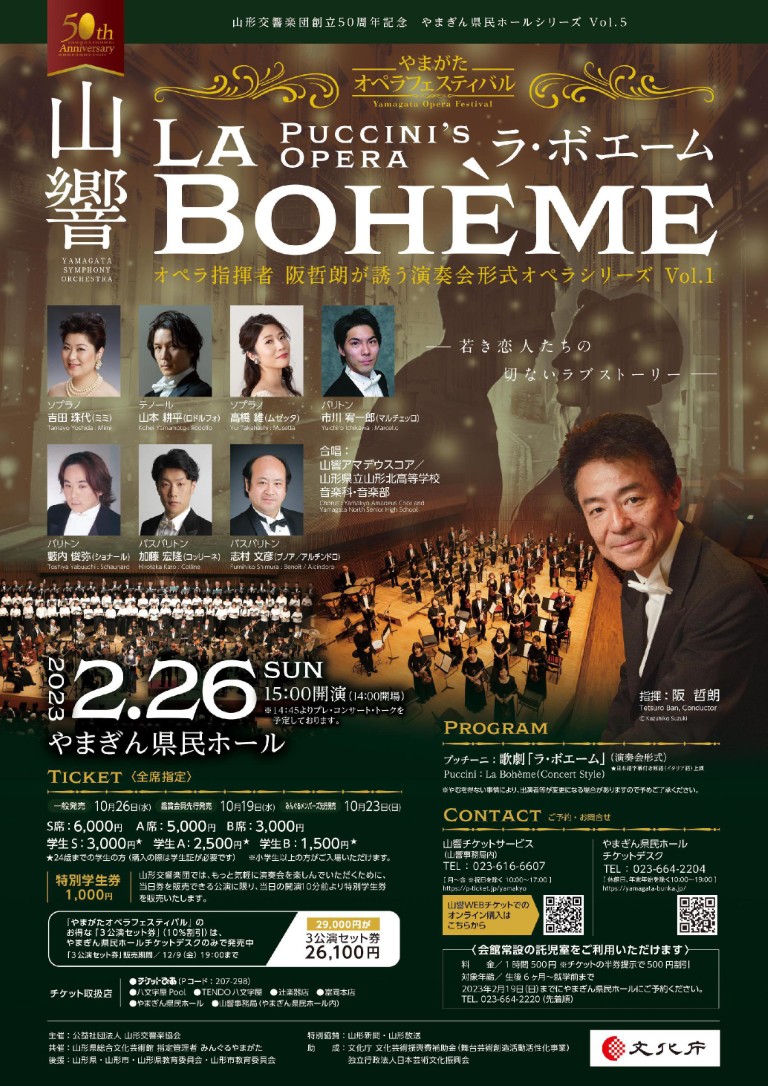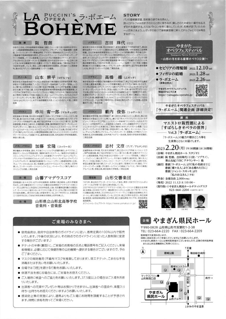 プッチーニ/歌劇「ラ・ボエーム」(演奏会形式)全3幕 | 指揮:阪 哲朗 ソプラノ:吉田珠代 テノール:山本耕平 ソプラノ:高橋 維 バリトン:市川宥一郎 バリトン:薮内俊弥 バスバリトン:加藤宏隆 バスバリトン:志村文彦 管弦楽:山形交響楽団 合唱:山響アマデウスコア | やまぎん県民ホール | チラシ表チラシ裏 | |