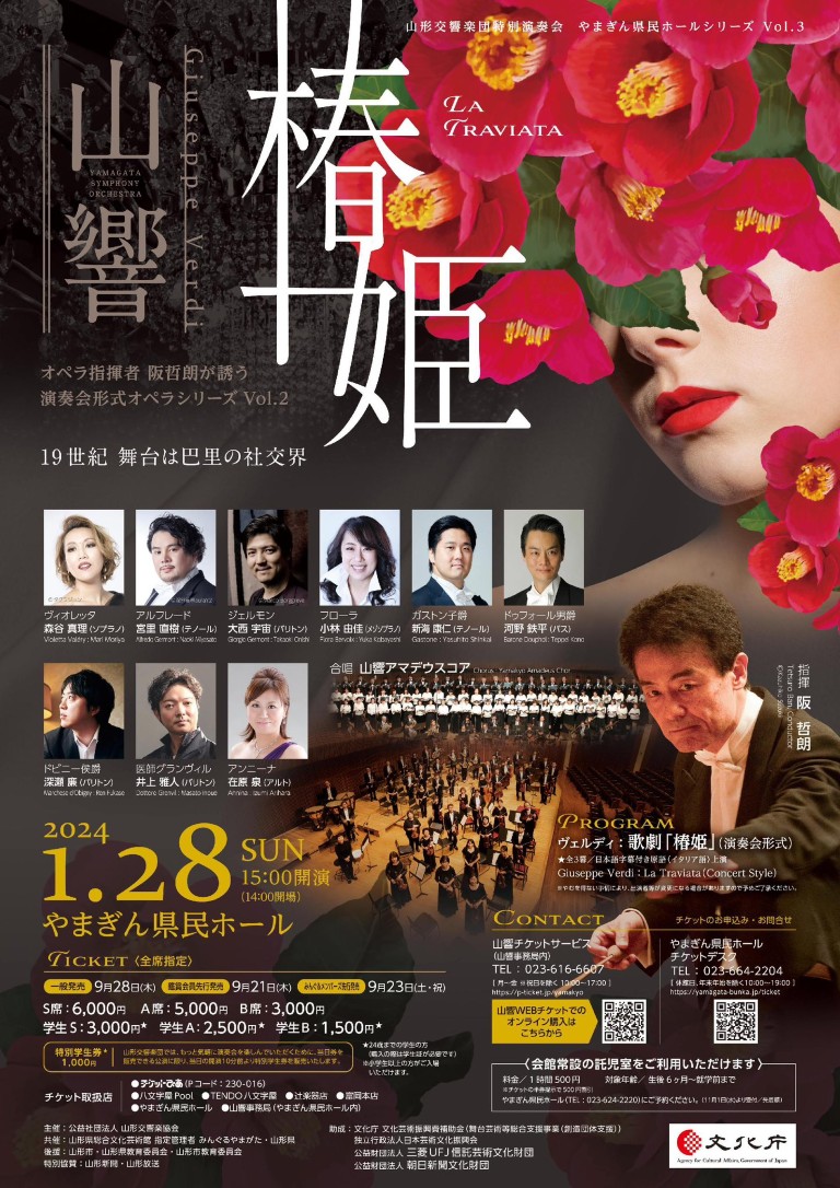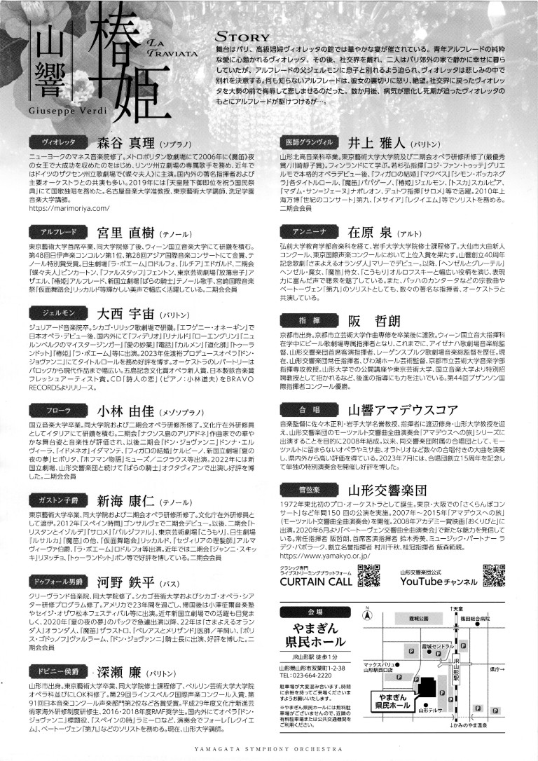 ヴェルディ/歌劇「椿姫」(演奏会形式)全3幕 | 指揮:阪 哲朗 ソプラノ:森谷真理 テノール:宮里直樹 バリトン:大西宇宙 メゾソプラノ:小林由佳 テノール:新海康仁 バス:河野鉄平 バリトン:深瀬 廉 バリトン:井上雅人 アルト:在原 泉 管弦楽:山形交響楽団・山形東高校音楽部・吹奏楽部 合唱:山響アマデウスコア | やまぎん県民ホール | チラシ表チラシ裏 | |