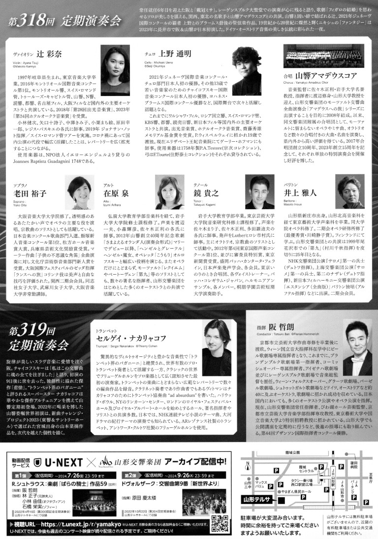 山響第318回定期演奏会 | モーツァルト/ミサ曲 ハ長調「戴冠式ミサ」K.317 | 指揮:阪 哲朗 ソプラノ:老田裕子 アルト:在原 泉 テノール:鏡 貴之 バリトン:井上雅人 管弦楽:山形交響楽団 合唱:山響アマデウスコア | 山形テルサホール | チラシ表チラシ裏 | |