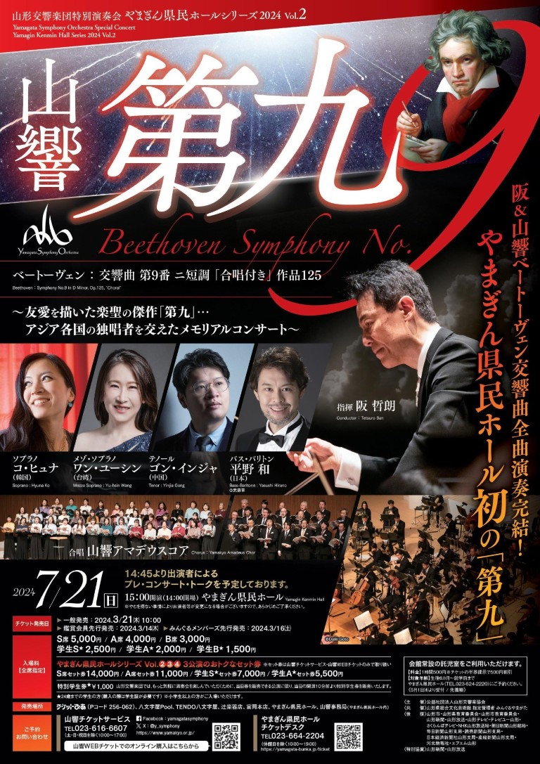 ベートーヴェン/交響曲 第9番 ニ短調「合唱付き」作品125 | 指揮:阪 哲朗 ソプラノ:コ・ヒュナ〈韓国〉 メゾ・ソプラノ:ワン・ユーシン〈台湾〉 テノール:ゴン・インジャ〈中国〉 バス・バリトン:平野 和〈日本〉 管弦楽:山形交響楽団 合唱:山響アマデウスコア | やまぎん県民ホール | チラシ表チラシ裏 | |