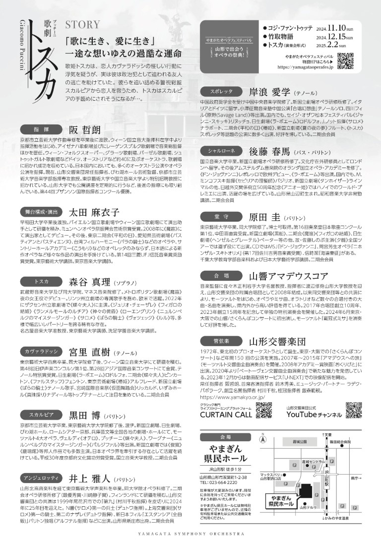 プッチーニ/歌劇「トスカ」(演奏会形式/日本語字幕付き原語<イタリア語>上演) | 指揮:阪 哲朗 トスカ:森谷 真理 カヴァラドッシ:宮里 直樹 スカルピア:黒田 博 アンジェロッティ:井上 雅人 管弦楽:山形交響楽団 合唱:山響アマデウスコア・他 | やまぎん県民ホール | チラシ表チラシ裏 | |