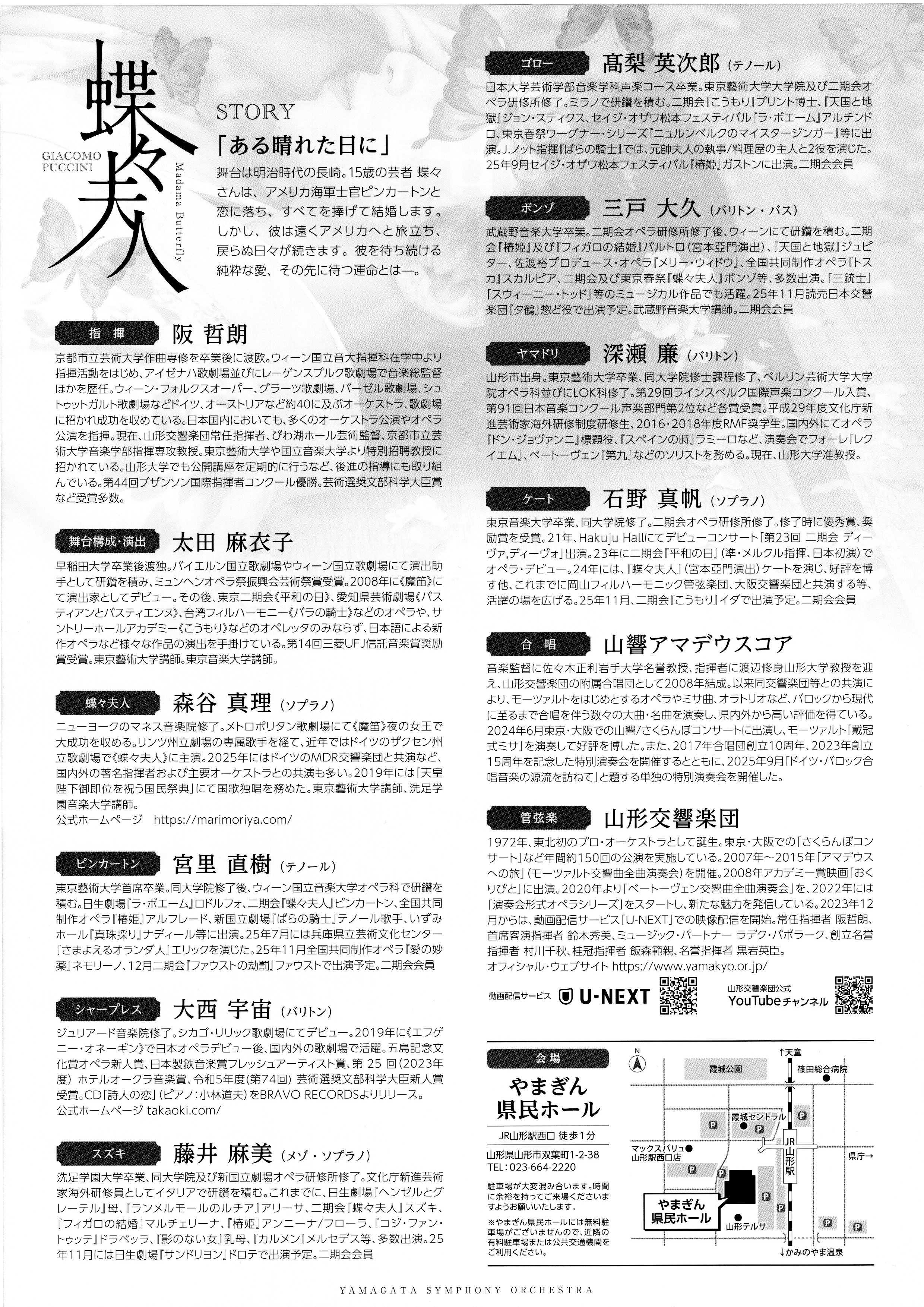 演奏会形式オペラシリーズⅣ | プッチーニ:歌劇「蝶々夫人」(演奏会形式/全2幕/日本語字幕付き原語上演) | 指揮:阪 哲朗 蝶々夫人:森谷 真理 ピンカートン:宮里 直樹 シャープレス:大西 宇宙 管弦楽:山形交響楽団 合唱:山響アマデウスコア・他 | やまぎん県民ホール | チラシ表チラシ裏 | |