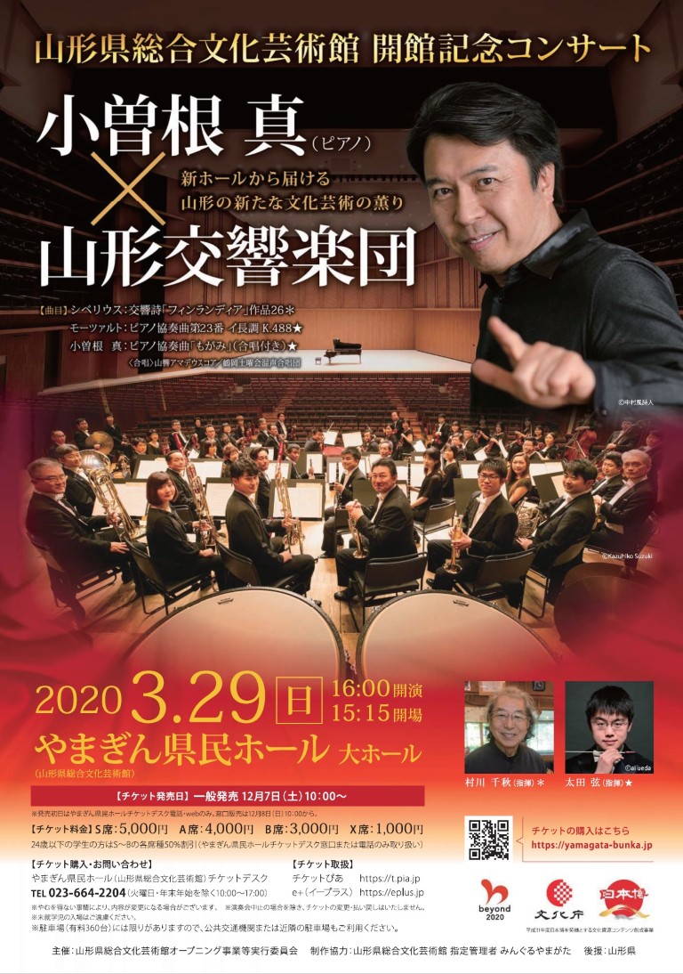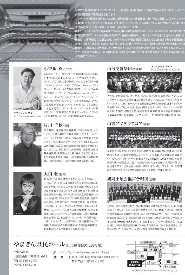 山形県総合文化芸術館開館記念コンサート | 小曽根真/ピアノ協奏曲「もがみ」(合唱付き) | 指揮:太田弦 ピアノ:小曾根真 管弦楽:山形交響楽団 合唱:山響アマデウスコア・他 | やまぎん県民ホール | コロナ禍で中止 | チラシ表チラシ裏 |
