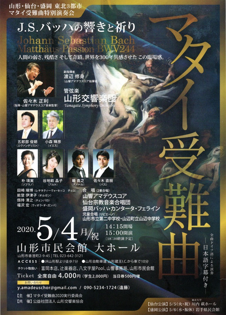 バッハ/マタイ受難曲 | 指揮:佐々木正利 ソリスト:五郎部俊朗・小森輝彦・他 管弦楽:山形交響楽団 合唱:山響アマデウスコア・他 | 山形市民会館 | コロナ禍で中止 | チラシ表チラシ裏 |