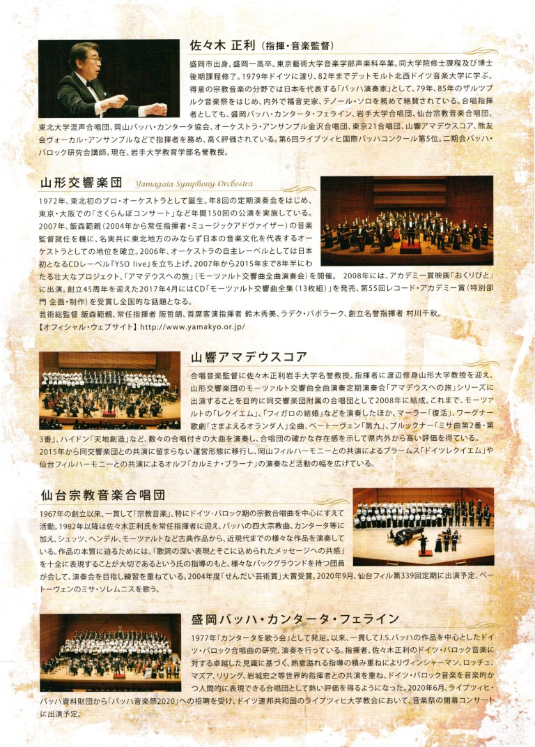 指揮:佐々木正利 渡辺修身 1stVn:犬伏亜里 茂木智子 2ndVn:平松典子 松田佳奈 Vc:三宅進 Cb:黒江浩幸 Fg:高橋あけみ オルガン・ピアノ:菅原美穂 合唱:山響アマデウスコア | 文翔館議場ホール(山形) | チラシ | |